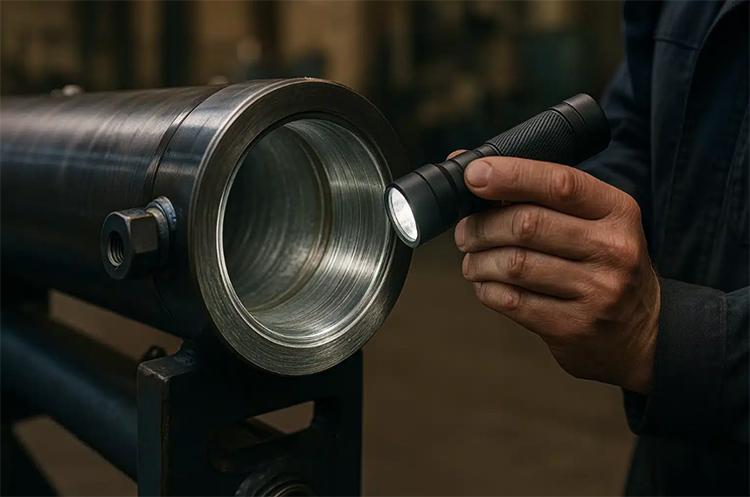Elke putjes of buiging van de zuigerstang zal onvermijdelijk de nieuwe hydraulische afdichting voortijdig laten falen. Draai bij het inspecteren de zuigerstang langzaam in volle licht en onderzoek het hele oppervlak zorgvuldig.